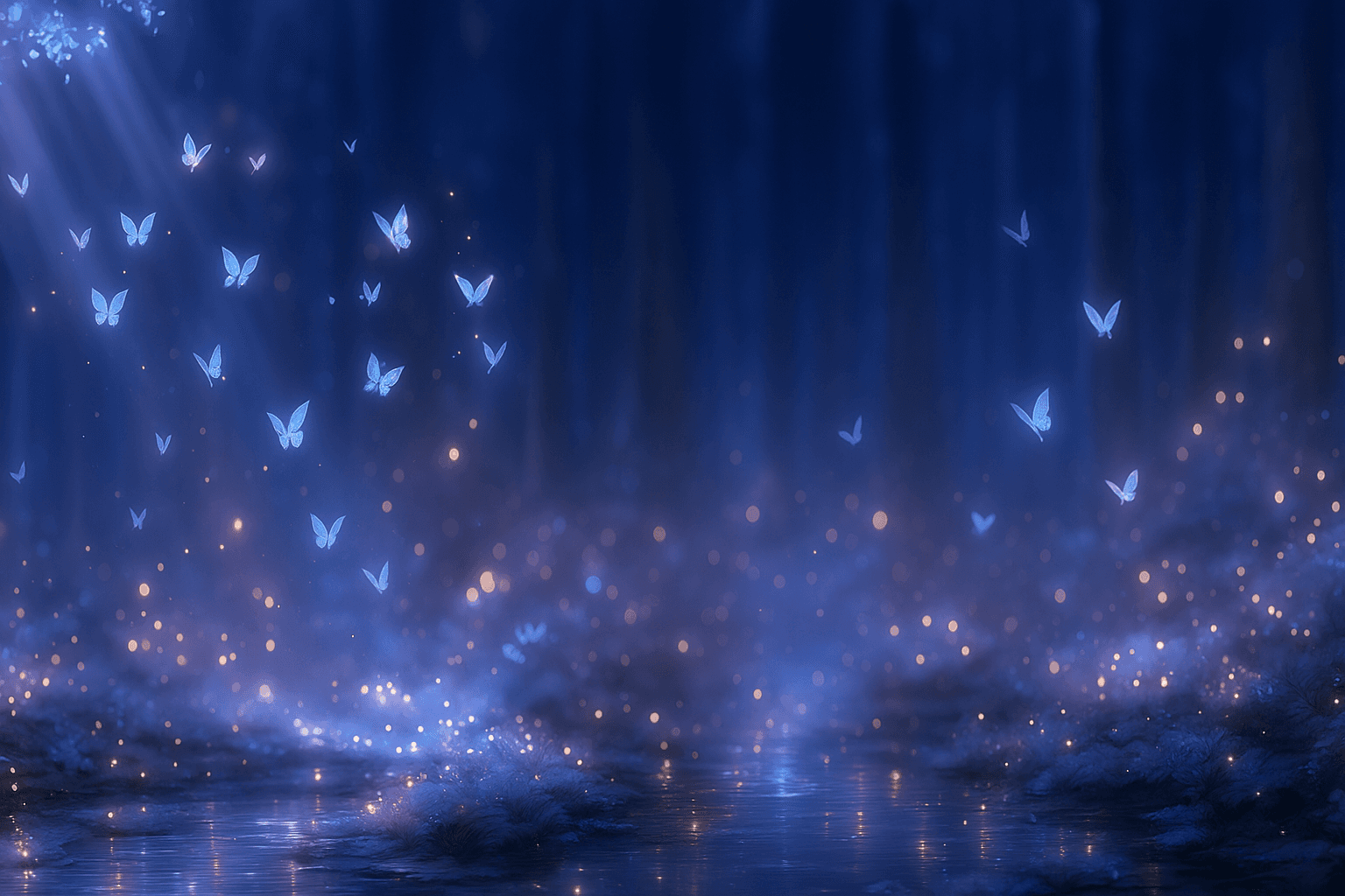 깊은 숲 속에서 신비롭게 떠오르는 빛과 나비, 뿔 위의 생명체들은