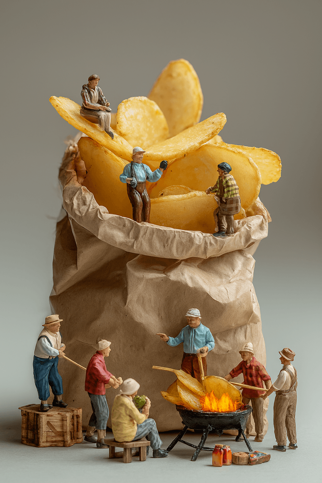 미니어처 피규어와 감자칩의 조합으로 생산 과정의 수고로움, 맛의 진정성, 그리고 브랜드 감성을 직관적으로 담아냈습니다.
